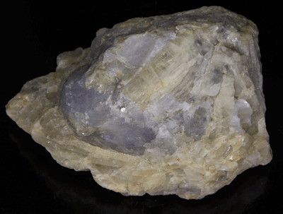 By now everyone is familiar with the sodalite (hackmanite) from Afghanistan; very tenebrescent, often phosphorescent, and sometimes nice crystals. This piece is a large crystal which has been wrapped by winchite. The winchite is what I find amazing here: under longwave it exhibits a beautiful greenish/blue fluorescence. Not all winchite does this - that's why we need you to hop on a plane and find the ones that do. There just aren't that many two-color longwave specimens around.