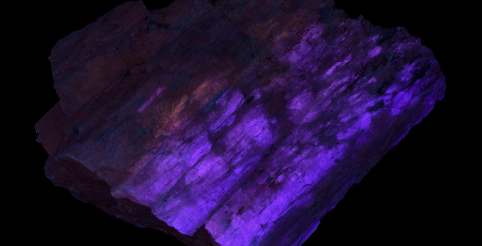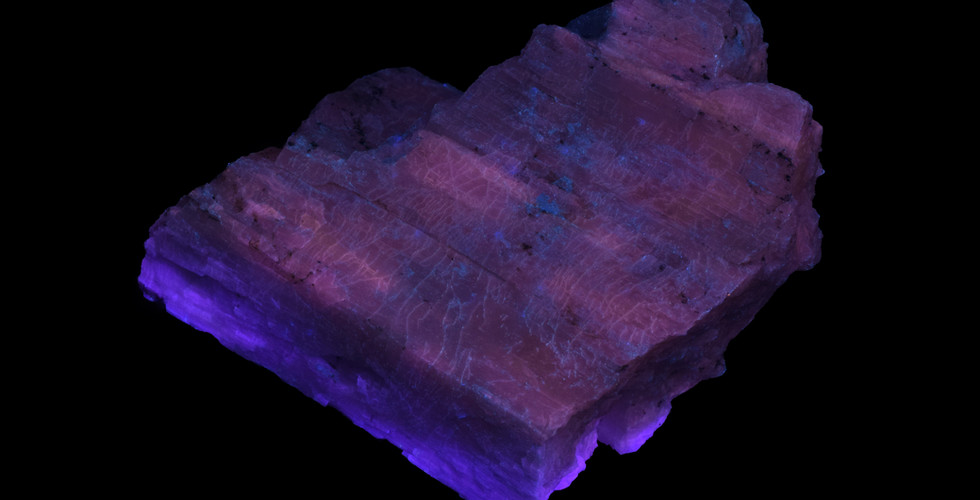 This is an off-white to pinkish section of a spodumene crystal, with two intact crystal faces, from the B.B. #7 Quarry, Norway, Oxford Co., Maine. This specimen shows a subdued, multi-wave fluorescent response. Under short wave UV, dim red/oranges are seen, with areas of brighter lilac. The long wave UV response is somewhat brighter, showing areas of red and sky blue-colored fluorescence. This specimen measures 47.9 x 46.1 x 16.9 mm, and weighs 51 grams.