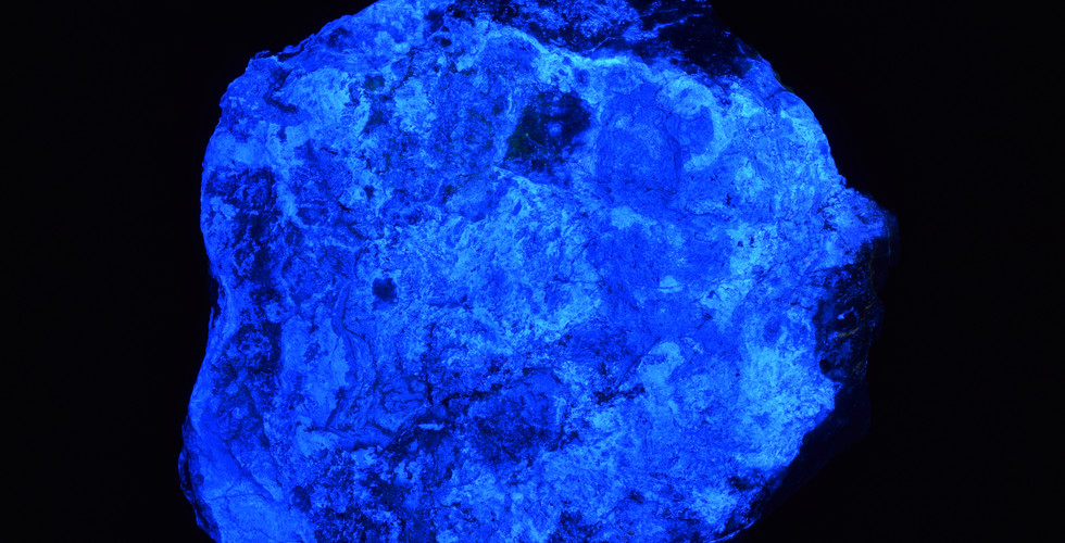 Normally I’m not a big fan of cutting or polishing rocks, as I prefer them in their original, natural condition. I’ll make an exception with this one though. It’s from Goodsprings, Clark Co., Nevada, and is a cut end slab of dolomitized limestone with an outer coating of brightly fluorescent hydrozincite. Hydrozincite is a zinc carbonate hydroxide, and occurs as an oxidation product of zinc ores, typically forming masses or crusts. Under short wave UV the hydrozincite fluoresces bright blue/white. The interior cut surface reveals fluorescent veins of hydrozincite following the internal cracks in the limestone host rock. The size of this specimen is 9.5 x 7.6 x 2.0cm.