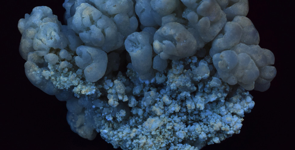 This is a very peculiar and interesting specimen of aragonite dripstone, collected in an unnamed cave in a limestone quarry in Shoals, Indiana. This brain-like, convoluted formation of off-white aragonite fluoresces blue/white under all UV wavelengths, with blue phosphorescence after short wave and green phosphorescence after long wave UV. The size of this unique specimen is 38 x 34 x 30 mm.