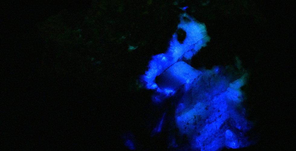 Fluorescent and phosphorescent response under various UV wavelengths. Interestingly, the limestone matrix is also fluorescent, most brightly under mid and long wave UV. Mouse over scrolling images for UV wavelength information.